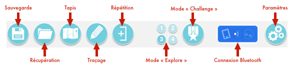 Ce menu vous permet de cacher certains boutons sur l'application. Par exemple, vous pourriez désactiver le bouton « tapis » pour que les enfants restent concentrés sur celui que vous avez déterminé. Des flèches de direction pourraient aussi être enlevées afin de créer de nouveaux défis, comme par exemple: « Comment aller du point A au point B si on ne peut que reculer? »