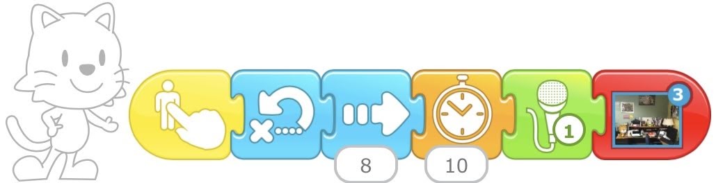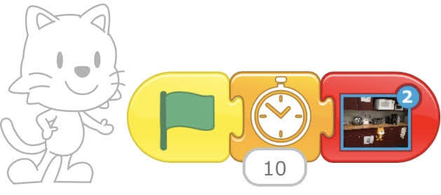 5. Scène 2 : Programmer le personnage pour qu'il se promène* dans la deuxième page. Ajouter un bloc d'attente et faire passer à la page suivante (déjà créée). *Il est possible d'enregistrer la voix pour narrer l'histoire. |