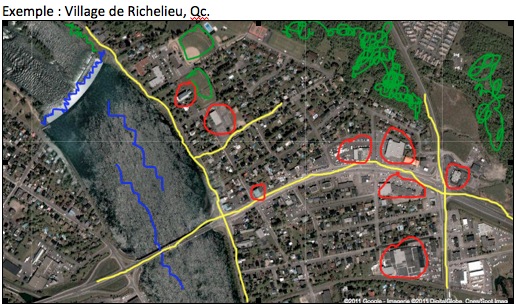 Au TNI ou à l’ordinateur, on peut aider les élèves à identifier les éléments connus du territoire à partir des images satellites de « Google Maps ». On suit les principales routes avec une couleur, on marque les cours d’eau, les champs ou les boisés avec d’autres couleurs, on encercle les principaux bâtiments avec une autre couleur (école, épicerie, église, industrie, pont, etc.). De cette façon, les enfants pourront plus facilement figurer l’organisation du territoire.